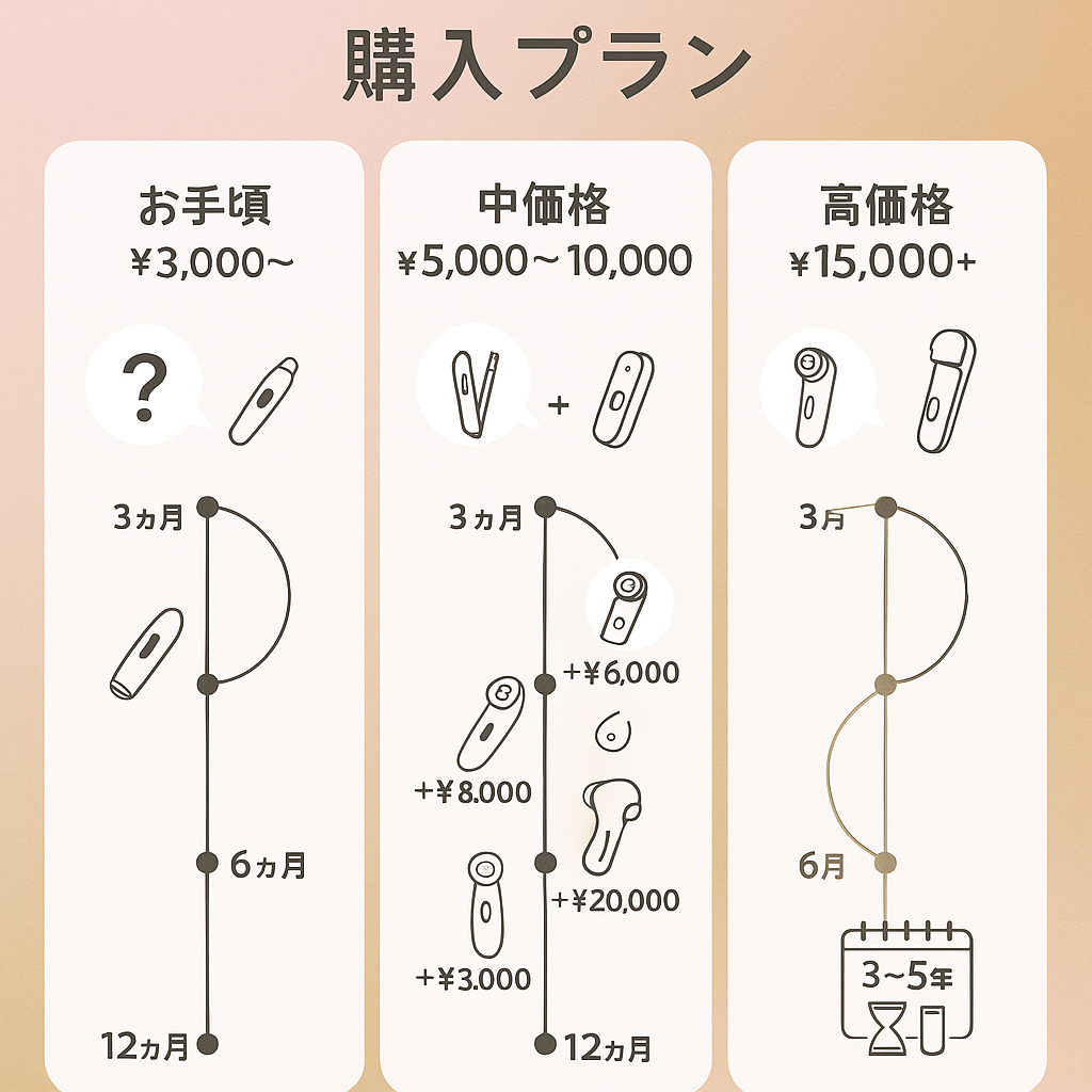 月3,000円以下: ✓ 超音波洗顔ブラシから始める ✓ 毛穴ケアで肌の土台を整える ✓ 継続しやすい価格で習慣化